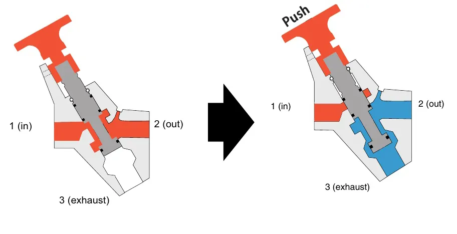 PIV 작동 방식빨간색 핸들을 안쪽으로 짧게 누르면 공급 공기의 흐름이 차단되고 밸브 하단의 배기 포트를 통해 다운스트림 공기가 배출됩니다.