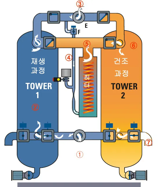 출구로 나가는 건조공기의 약 14%는 Orifice (C)를 통하여 2 번 타워의 상부에서 하부로 이동하면서 2번 흡착탑 내의 흡착제에 포함된 수분을 탈착하여 건조 시키는 재생과정을 거친 후 Purge Valve (D)를 거쳐 Muffler (E)를 통해 외부로 배출됩니다. 설정된 시간 후에 Purge Valve (D)가 닫히게 되고 일정시간 동안 2번 흡착탑의 압력이 서서히 상승하여, 1번 흡착탑의 압력과 동일한 압력이 된 후 1번 흡착탑과 2번 흡착 탑의 공정이 바뀌게 됩니다.이러한 일련의 건조  재생
