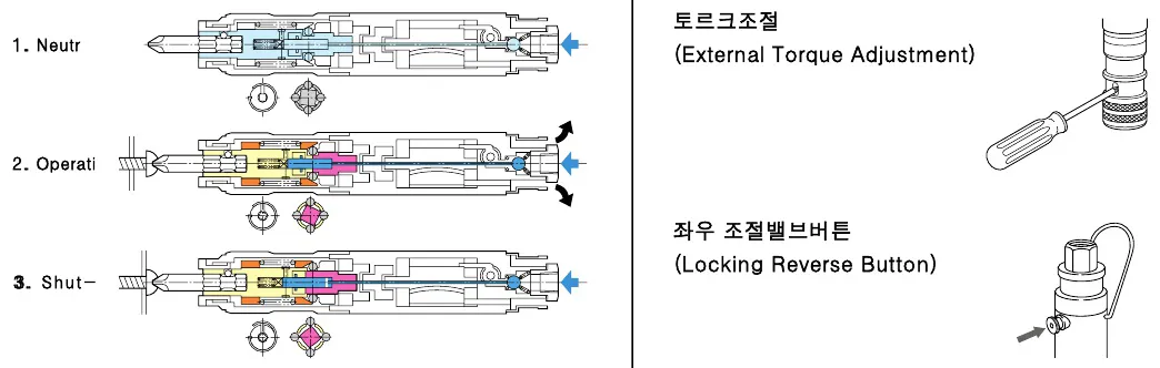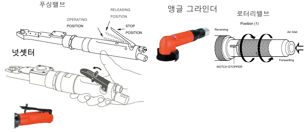 시동 레버를 밀거나 당기면 공기가 삽입된 부분을 통과하고 작동이 시작됩니다. 레버는 각각의 작업 내용물과 조건에 따라 사용하기 쉬운 위치와 형태로 설정되어 있습니다.