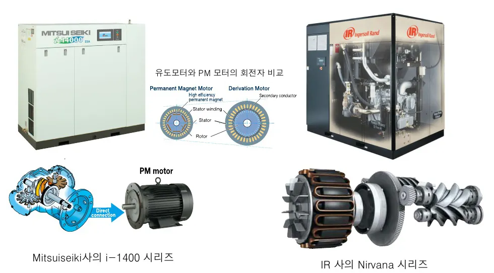 그에 따라 전동기 회전자에 영구자석을 사용한 고효율 영구자석 동기전동기(PM 모터)가 주목받고 있는데, PM 모터는 전동기의 회전자 도체 대신 영구자석을 사용한 VSD 모터이다.
