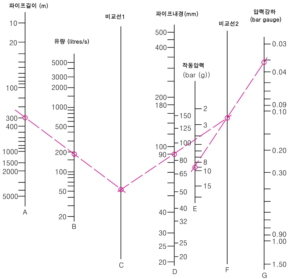 ⓐ축에서 잡고 ⓑ축에서 소요 공기량을 잡아 선을ⓒ축까지 연장하여 긋는다. 다음 ⓔ축의 압력에서 사용압력 8.0㎏/㎠의 점과 ⓖ축의 압력강하 0.1㎏/㎠의 점을 잇는 선을 ⓕ축을 가로질러 긋는다. ⓒ축과 ⓕ축의 교차점을 잇는 선을 그어 ⓓ축과 교차하는 점이 구하고자 하는 PIPE의 내경이다.(Ø88㎜)