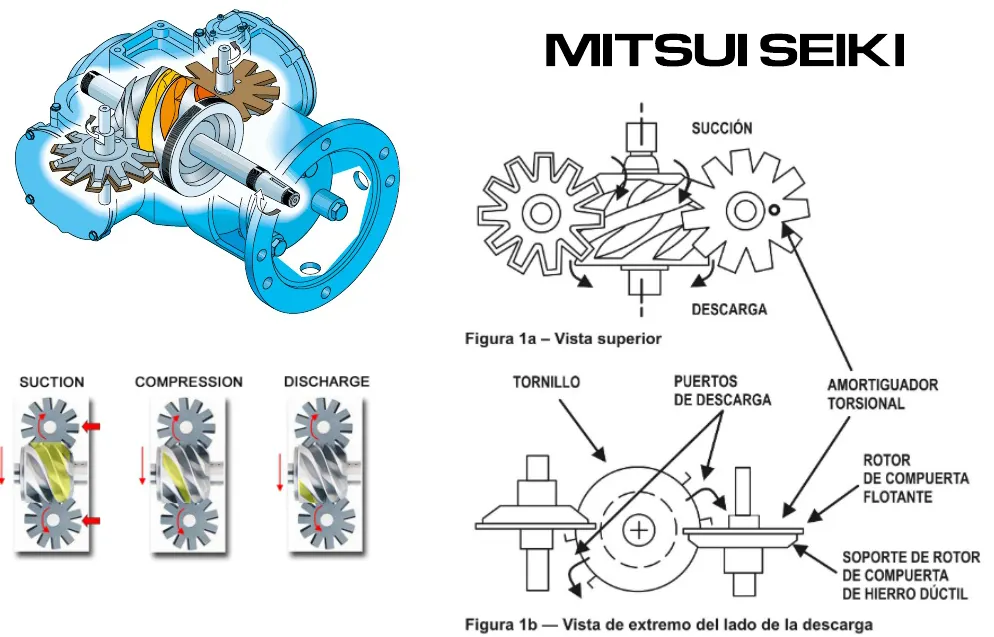 (2) 스크류 로터의 회전에 따라 게이트 로터의 톱니가 이동하고, 벌어진 홈의 공간에 용적이 축소되어 갇힌 공기는 압축되어 압력이 상승한다.