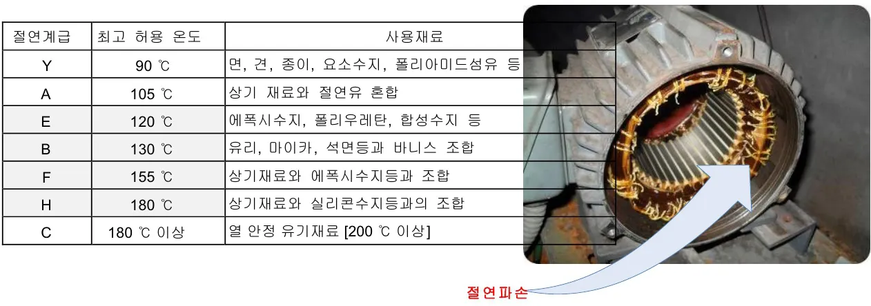 모터에 적용된 절연물의 최고 사용 허용 온도를 기준으로 구분한 것을 절연 계급이라 하며 다음과 같이 7 개의 종류로 대별된다.