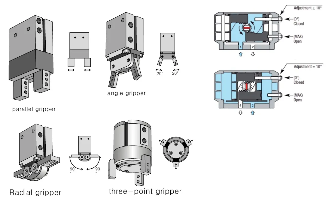 로보틱 유형 응용 프로그램에서 구성 요소를 그립하도록 설계된 액추에이터입니다. 표시된 유형에는 죠를 열고 닫을 수 있는 두 개의 반대되는 피스톤이 있습니다. (An actuator designed to grip components in robotic type applications. The type shown has two opposing pistons, to open and close the jaws.)