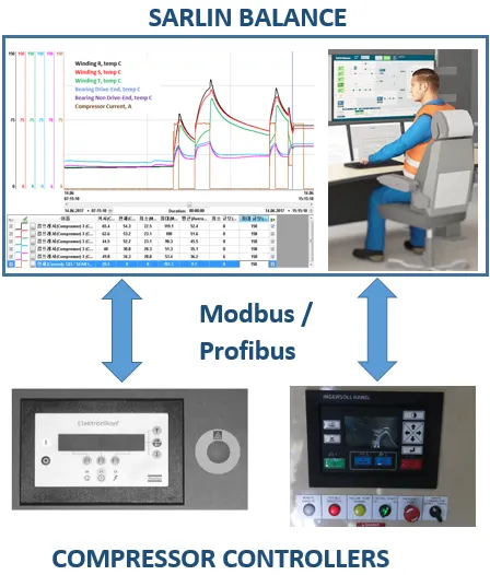 Sarlin Balance는 Modbus RTU 또는 Profibus가 압축기 컨트롤러의 데이터를 인터페이스 할 수 있는 기능을 제공합니다. 압축기 컨트롤러에 대한 Modbus 또는 Profibus 인터페이스를 통해 압축기 제조업체의 사양에 따라 컨트롤러를 읽고 쓸 수 있습니다. 일반적으로 컨트롤러는 내부 압력, 온도, 경보 및 경고의 압축기 값을 제공합니다. 압축기 인터페이스가 사용 중일 때 Sarlin Balance는 감독을 위해 사용 가능한 모든 컨트롤러 데이터를 제공하고 값을 기록 추세로 기록합니다.