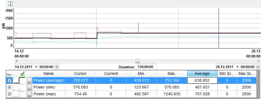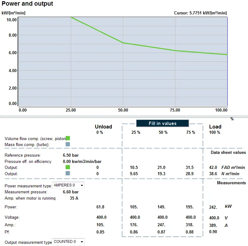 Sarlin Balance 시스템에서 검증된 전력 데이터를 가져옵니다. 압축 공기 시스템의 전력트렌드 화면을 엽니다. 검증 측정 기간을 선택합니다. 평균 압축기 전력 값을 읽습니다.