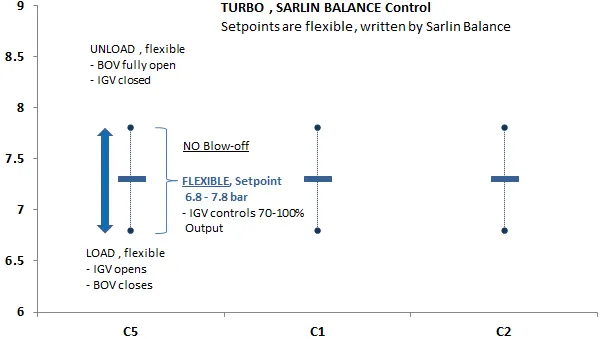 Sarlin Balance는 터보 컨트롤러에 자동으로 설정값을 기록하여 터보의 부하율 (즉, 공기 흐름)을 관리합니다. 터보 압축기의 부하율은 모터 전류와 IGV 및 BOV 밸브의 위치를 판독하여 지속적으로 모니터링됩니다.
