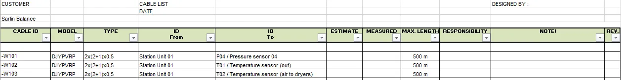 Sarlin은 케이블 목록 및 케이블 이름 (Sarlin 표준에 따름)을 포함한 케이블 설계를 제공합니다.