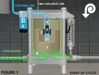 올바른 양의 응축수가 배출되어 액체 밀봉이 남으면 플로트가 낮아져 플로트 자석이 내부 자석을 통과하여 밸브 스템에 대해 위로 밀어냅니다. 이렇게 하면 작동 실린더로의 제어 공기 흐름이 중단되고 실린더는 홈 위치로 돌아가 배출 볼 밸브가 닫혀 응축수 흐름이 중단됩니다. 그림 1과 같이 사이클의 이 지점에서 응축수가 다시 저장고에 축적되기 시작하고 사이클이 반복됩니다.